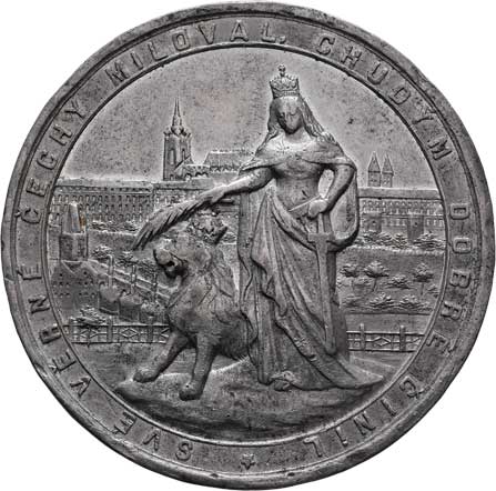 mírně zleva, opis / Čechie se lvem, Pražský hrad, opis, 42mm, ČS.1508, Don.3156, dr.hr., dr.rysky, úhoz |