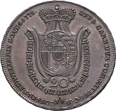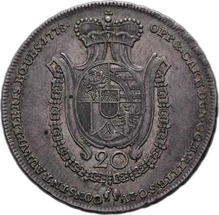 | 624. | 20 Krejcar 1778, Poprsí zprava, opis / korunov. znak