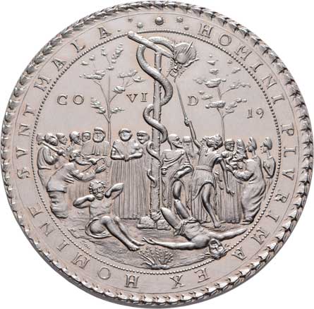 - dvě alegorické postavy, pohled na město, nápis, Sign., patinovaný bronz 58x72 mm, škr., skvrnky |