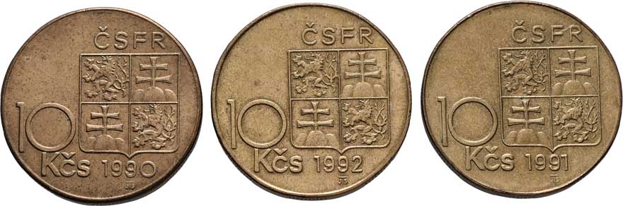 stojny M), 10 Kčs 1991 - M.R.Štefánik, 10 Kčs 1992 - A.Rašín, 8.000g, 7.974g, 8.052g, nep.rysky, pat. 3ks |
