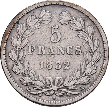 2104. 5 Frank 1832 A, Paříž, KM.735.1 (Ag900), 24.587g,