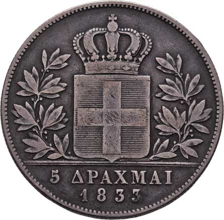 2192. 5 Drachma 1833 bz, Paříž, KM.20 (Ag900), 21.678g,