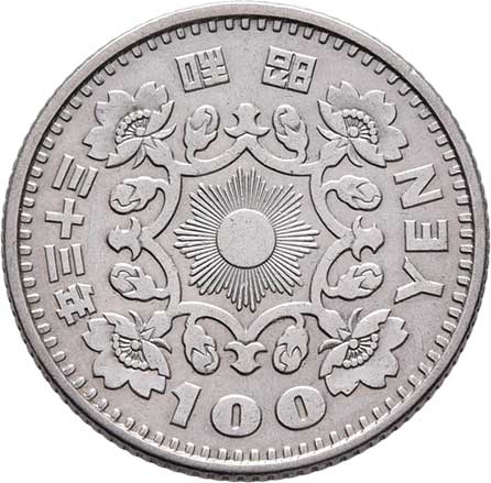 | 2598. | 100 Yen, rok 33 (= 1958), Y.77 (Ag600), 4.752g,