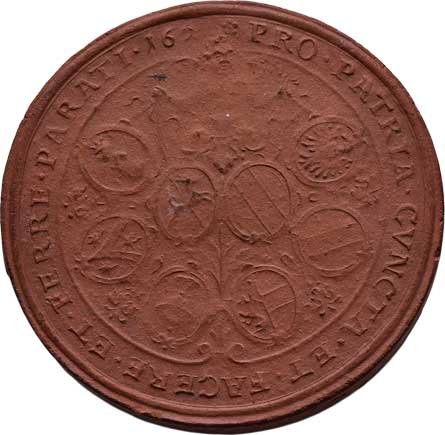 zbraně, zbroj a prapory ve věnci / 7-řádkový nápis ve věnci, Nesign., cín 29 mm s pův.ouškem a stužkou |