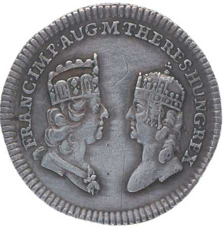 Dvojportrét Frant.Lotrinského a Marie Terezie zprava, opis / stojící Bellona s mírovými atributy podává věnec klečící Moravii, 2řádk.nápis, opis, Nesign., Ag 46 mm, 34,96 g, Mo.1865, SD.136a LG.XIV/146 RR! |