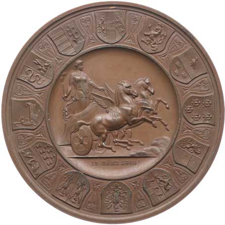 Poprsí zprava, opis / Austria sedící na trůnu, Putti s rohem hojnosti, opis, Sign., Bronz 60 mm |