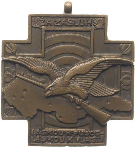 Ve středu tři věže, opis / sokol držící pušku, obrys republiky, nápis Bronz.kříž 39x39 mm orig.ouško |