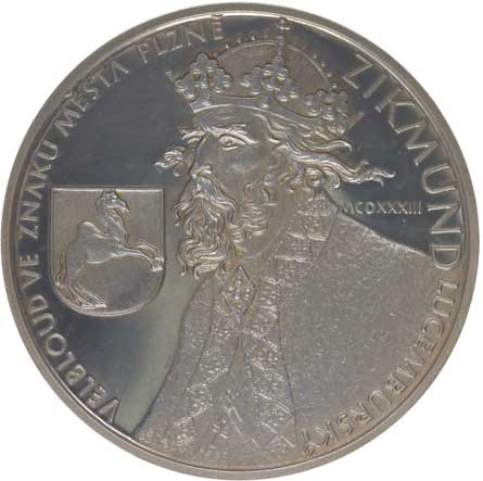 Trůnící Karel IV. zpředu, opis a nápis / gotické "K", kružba, znaky, opis, Sign., Punc.900, Ag 40 mm, 30,72 g, BK.1/14, MF.A1/14a dr.hr. |