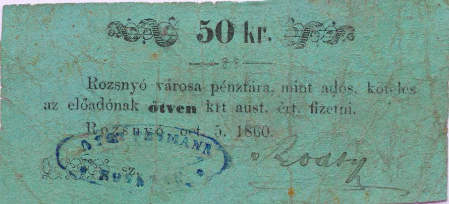 3401. | Rožňava (Rozsmyó) - 50 Krejcar 5.10.1860, bez čísla, s razítkem