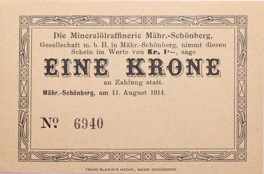 3405. | Šumperk (M.Schönberg), mineral.raf., 1 Krone 11.8.1914,