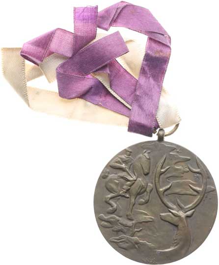 Jzdec s puškou na koni, hlava jelena / podkova, vročení v rámečku Sign.Nušl, Bronz 44 mm orig.ouško se stuhou |