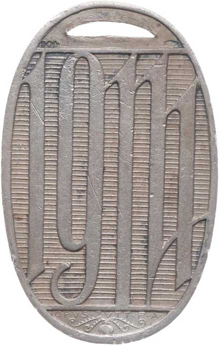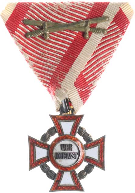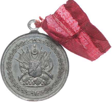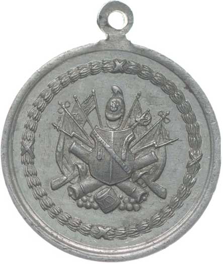 8.9.1877, vojenské atributy ve věnci / 7řádk.nápis ve věnci Sn 29 mm orig.raž.ouško s červenou stužkou |
