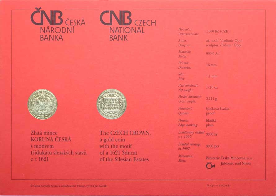 | 1461. | Karta (certifikát) pro minci 1000 Kč 1997 - třídukát Slezských stavů | N | 300,- | --.- |