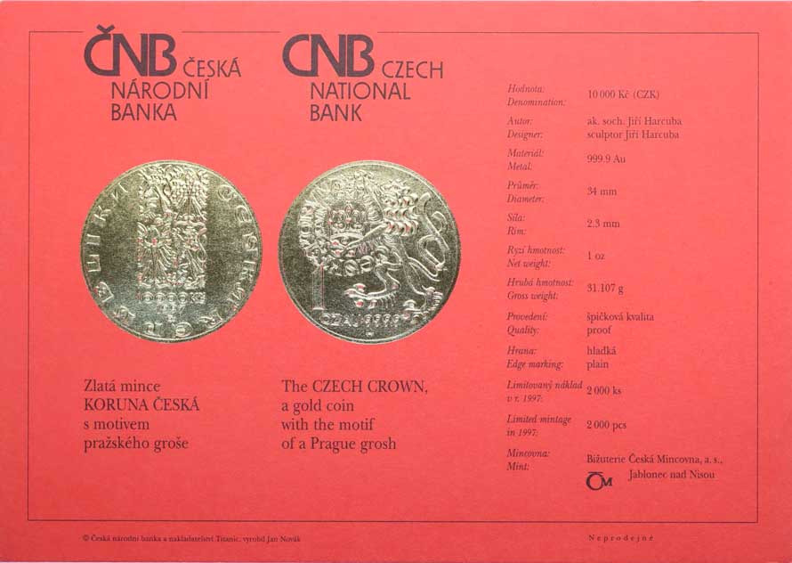 | 1464. | Karta (certifikát) pro minci 10000 Kč 1997 - Karel IV. | N | 300,- | --.- |