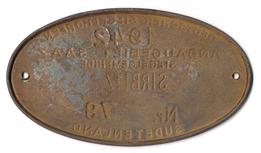 Sudetenland (Sudety Žatec Sýrovice, pečetící známka na 1 cent chmele), lisovaný plechový ovál 138x78 mm, prášková koroze |