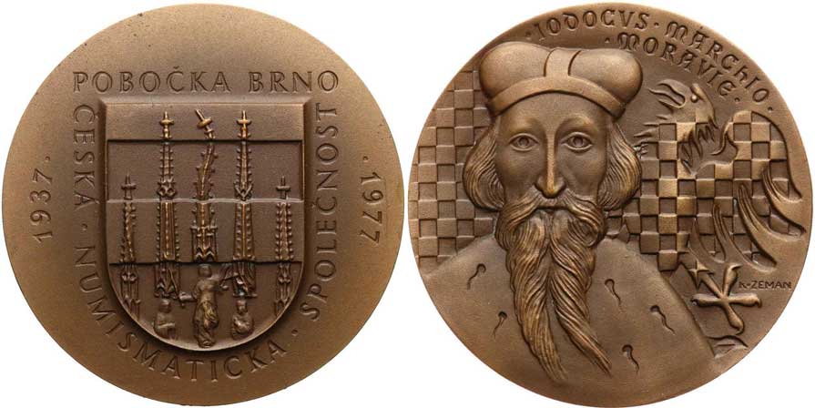 | 1256. | Zeman K., 1977. – 40 let pobočky. – Městský znak, vroč. 1937–1977 / markrabě Jošt. – Bronz, 70 mm, BK-5/7, ZK-12. | 0/0 | 300,- | 500,- |