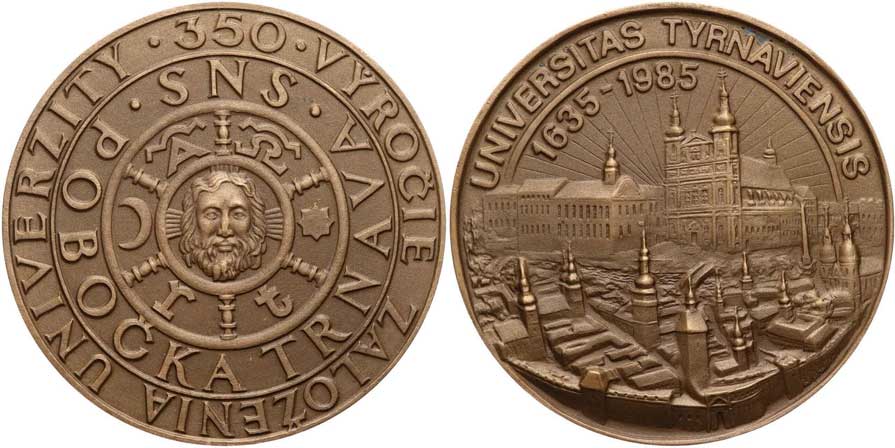 | 1300. | SNS, pobočka Trnava, Schiffer W., 1985. – Na 350. výročí Trnavské univerzity 1635–1985. – Pohled na město, latinský opis / městský znak, trojnásobný opis. – Bronz, 70 mm. | 0/0 | 200,- | 550,- |