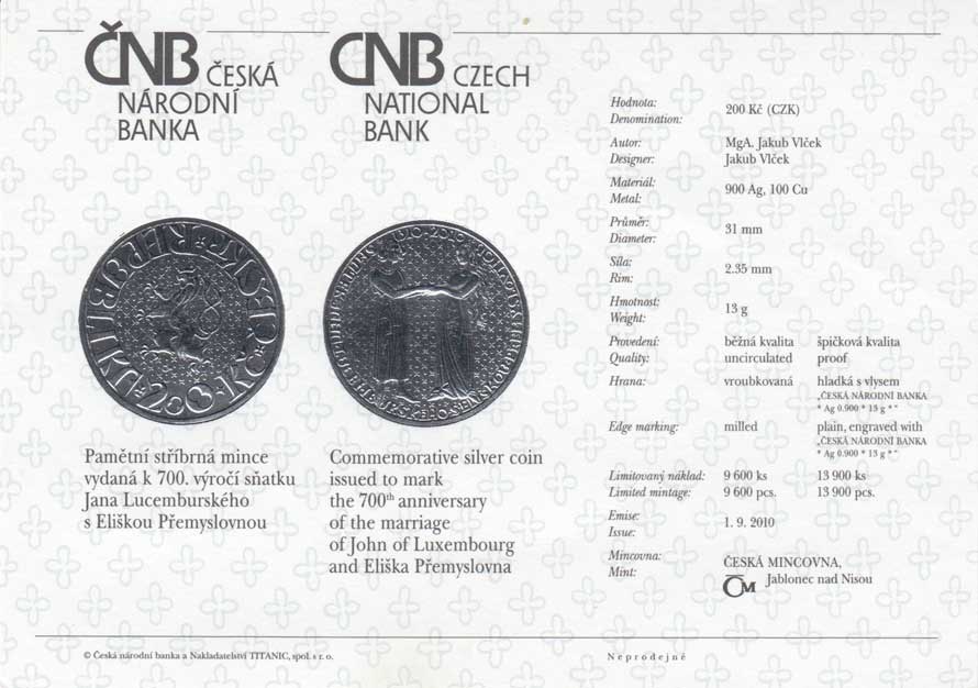 | 1718. | 200 Koruna 2010 - 700 let sňatku Jana Lucemburského
