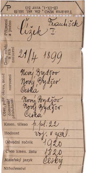 Čížek, naroz. 21.4.1899 v Novém Bydžově", 22.pěší pluk, 37x52 mm se závěsným ouškem a šňůrkou |