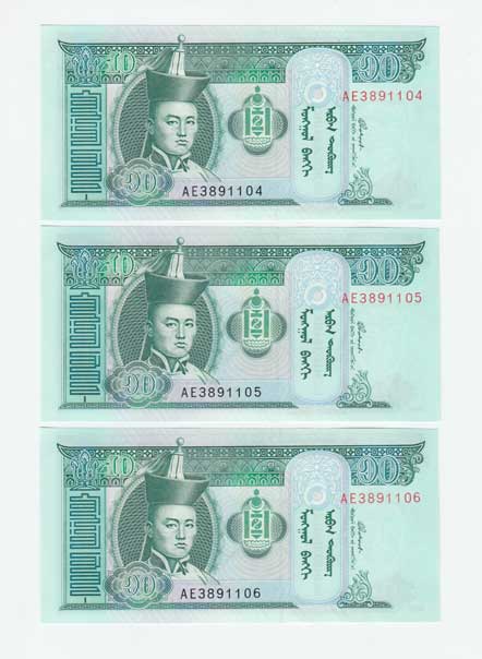 | 3498. | 10 Tugrik 2005, Pick.62c, tři následující čísla | N | 20,- | |