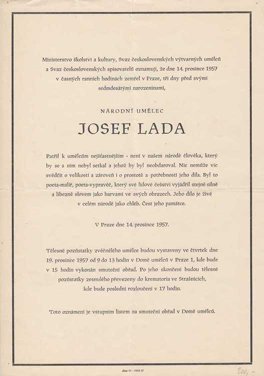 | 3819. | Josef Lada - 14.prosince 1957, 2x přeložené, krásně | zach. | 150,- | |