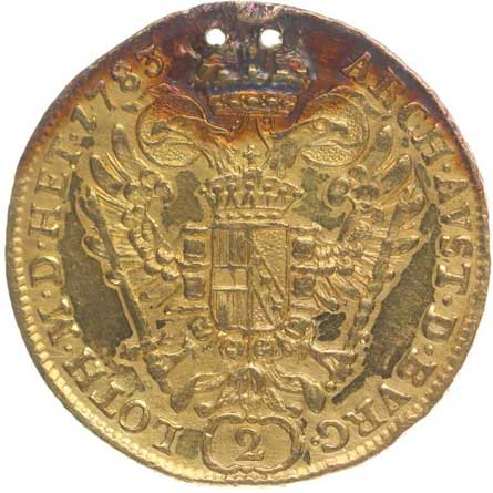 | 12. | 2 Dukát 1783 E, Karlovský Bělehrad, P.17 dvě dírky po korunce | 2/1- | 6000,- | --.- |