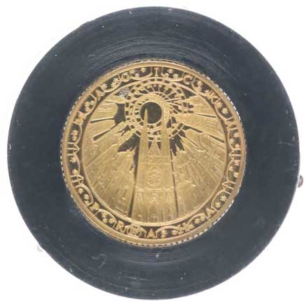 Průmyslový palác, v pozadí dívka, krajkový motiv, opis Sign.OZ, Au dutá klipa 29x29 mm, 4,15 g, nepunc. (ryz.900 - přiložen doklad punc.úřadu) dr.perf.raž. |