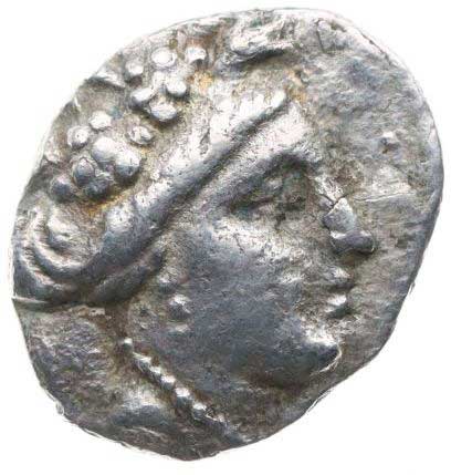 | 221. | AR Hemidrachma, hlava čelně mírně zprava / květ růže a monogram
