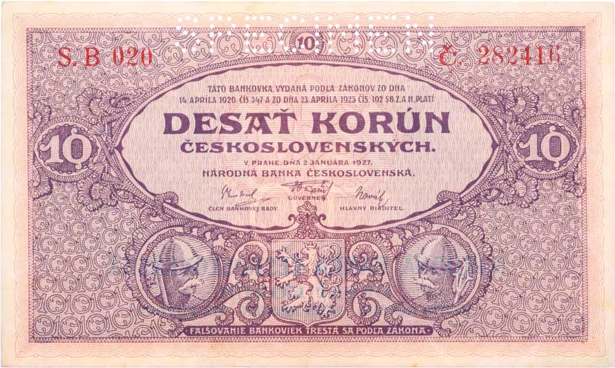 | 1295. | 10 Kč 1927, série B020, B.22c, Hejz.22bS1 "SPECIMEN" | 0 | 500,- | --.- |