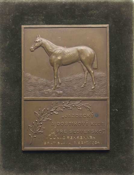 Stojící kůň zleva, 3řádk.nápis a 2 řádk.vyrytý nápis JUNIORENRENNEN BRATISLAVA 7.SEPT.1924 Bronz.plaketa 51x74 mm na sametové podložce jednostranná |