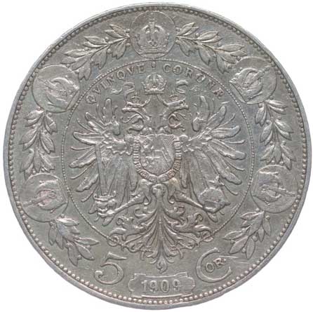 | 1077. | 5 Koruna 1909 b.zn. Schwartz | tém.0/0 | 2400,- | --.- |