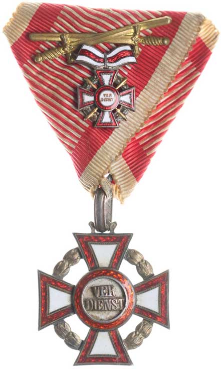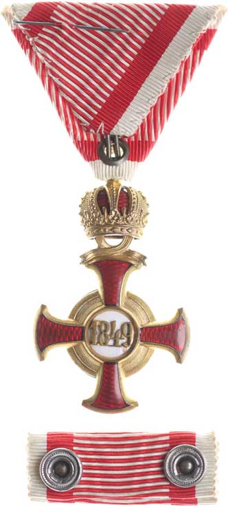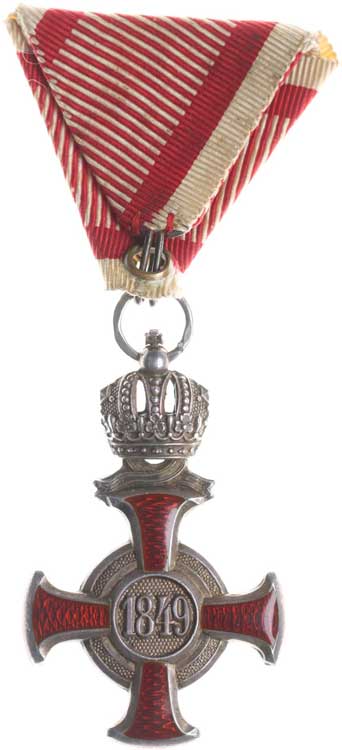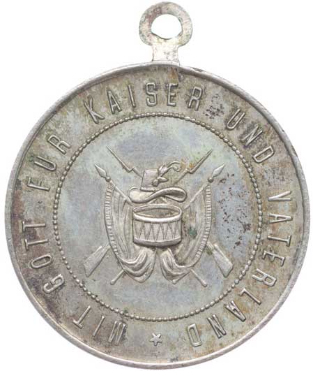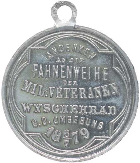 8.9.1877, vojenské atributy ve věnci / 7řádk.nápis ve věnci Sn 29 mm orig.raž.ouško s červenou stužkou |