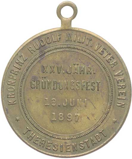 prince Rudolfa 18.7.1897, vojenské atributy, opis / 4řádk.nápis, opis Pozlac.bronz 31 mm orig.raž.ouško |