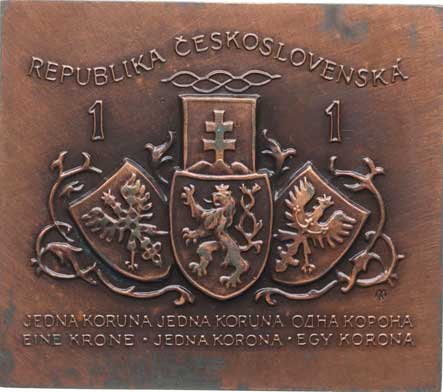 Poprsí mírně zprava, nápis / faksimile 1 Koruny 1919, Sign., Bronz.plaketa 60x52 mm, FM.A10/17c |