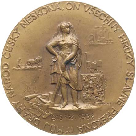 Mapa republiky s pahýlem lípy, ruce uchvatitelů, opis / alegor.postava, symboly, opis, Sign., Bronz 55 mm, 58,41 g |