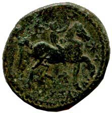 25. AE 18 mm A: Hlava Apolla vpravo R: Jezdec na koni vpravo, dole zvíře
