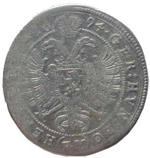 452. XV Krejcar 1694 Praha, Neobsazeno MKČ 1410 stuhy přes krk orla -1/1 650,- 650,-