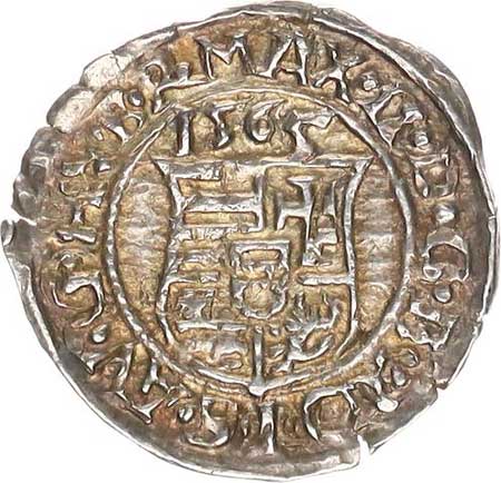 666. | Malý (černý) peníz 1565, K.Hora-Ludvík Karel+Šatný "RR"