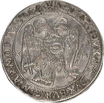 perel s malým křížkem, žezlo protíná perličkový kruh, nevýrazný v nitřní hladký kruh / bez arabesek kolem erbu, rozděl. zn. v opise jetelové lístky 24,254 g vada stř. na hr. Rv. |