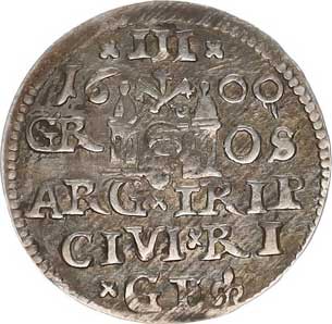 | 4081. | III groš 1600 Riga, Wulf opis: III / GR-OS / ARG. TRIP / CIVI.R