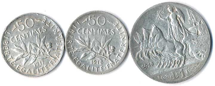 | 843. | 1 Lira 1913, Francie, 50 Centimes 1917,1918, 3ks | 1-1- | 250,- | --.- |